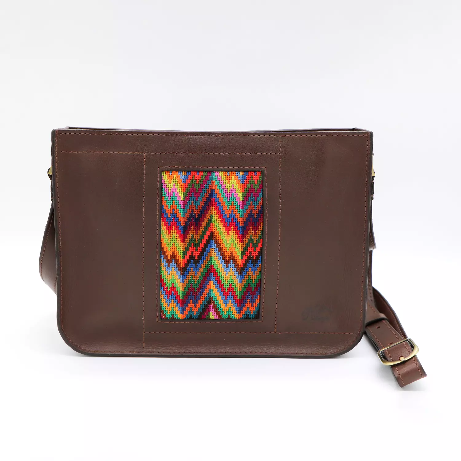 Dark brown genuine leather bag with colorful cross-stitching.